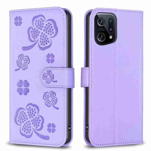Para Oppo Find X5 Funda para Teléfono de Cuero con Relieve de Cuatro Hojas (Púrpura)