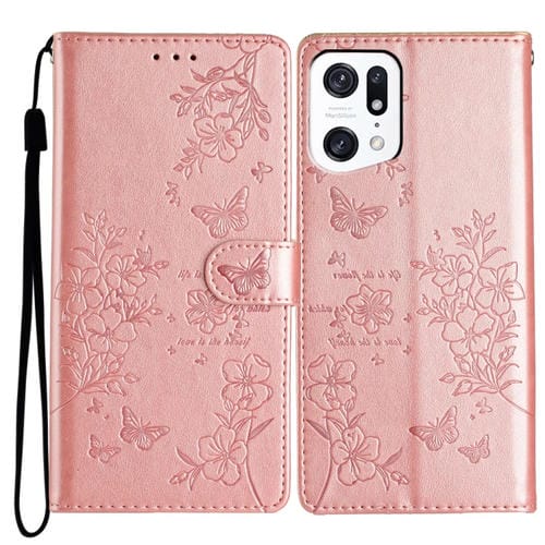 Para Oppo Find X5 Pro Butterfly Love Flower Funda de Cuero para Teléfono En Relieve (Oro Rosa)