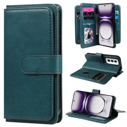 Para Oppo Reno12 5G Cartera Multifunción Global 10 Ranuras para Tarjetas Funda de Cuero para Teléfono (Verde Oscuro)