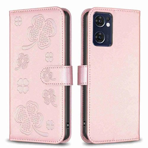 Para Oppo Reno7 5G / Find X5 Lite Funda de Cuero con Relieve de Cuatro Hojas para Teléfono (Rosa)