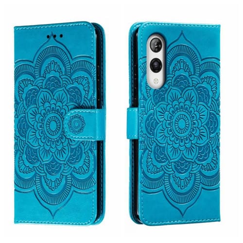 Funda de Cuero para Rakuten Hand 5G con Patrón en Relieve Sun Mandala (Azul)