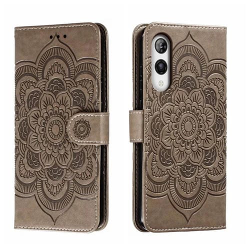 Funda de Cuero para Rakuten Hand 5G con Patrón en Relieve Sun Mandala (Gris)