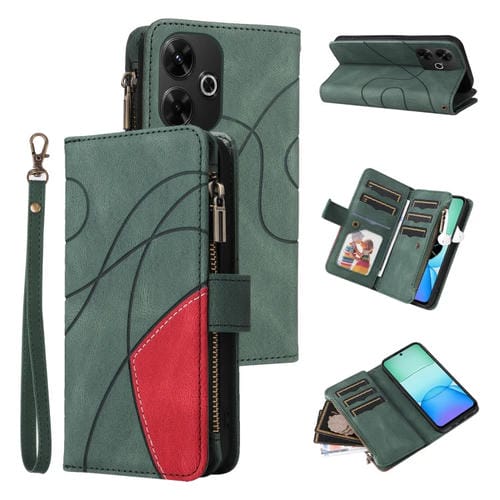 Para Redmi 13 4G Global Funda de Cuero para Teléfono con Billetera con Cremallera y 9 Ranuras para Tarjetas de Doble Color (Verde)