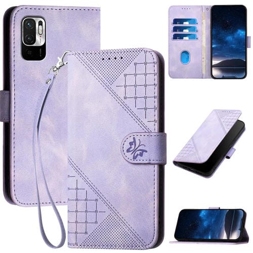 Para Redmi Note 10 5G Yx0080 Funda de Cuero con Tapa y Patrón En Relieve de Mariposa En Cuadrícula con Cordón (Morado Claro)