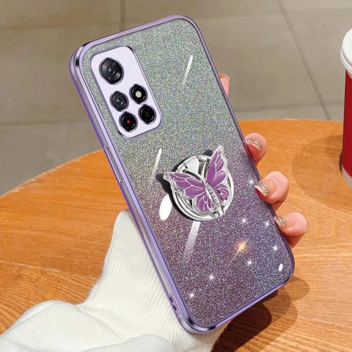 Para Redmi Note 11 5G Estuche para Teléfono de TPU con Soporte de Mariposa con Brillo Degradado Plateado (Púrpura)