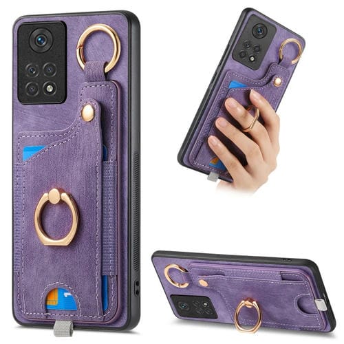 Para Redmi Note 11S Funda para Teléfono con Bolsa para Tarjeta con Anillo y Sensación de Piel Retro con Lazo para Colgar (Púrpura)