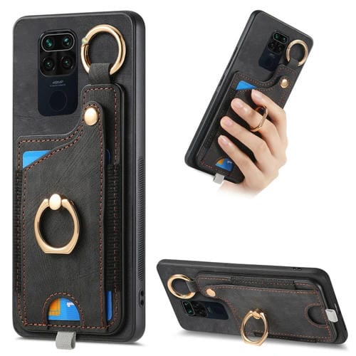 Para Redmi Note 9 Funda para Teléfono con Bolsa para Tarjeta con Anillo y Sensación de Piel Retro con Lazo para Colgar (Negro)