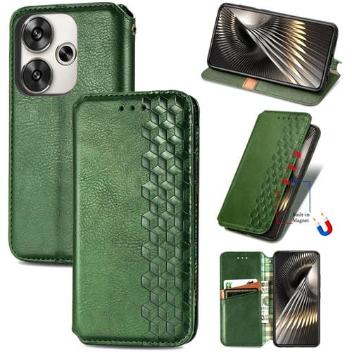 Para Redmi Turbo 3 5G Cubic Grid Funda de Teléfono de Cuero Magnético Prensado (Verde)