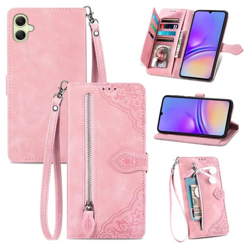 Funda de Cuero Samsung Galaxy A05 con Cremallera y Flores en Relieve (Rosa)