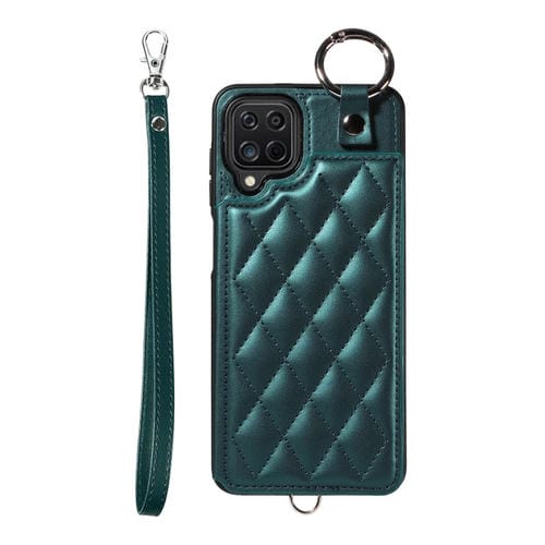 Estuche para Teléfono Samsung Galaxy A12 4G con Bolsa para Tarjetas Textura Rómbica y Cordón Corto (Verde)