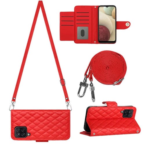 Funda de Cuero para Samsung Galaxy A12 M12 con Tapa Textura Rómbica y Cordón Largo (Rojo)