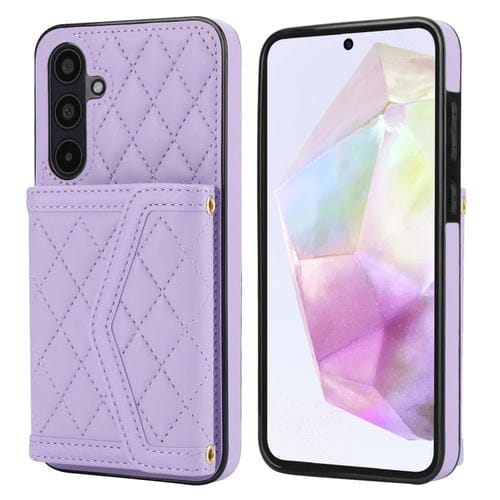 Estuche para teléfono Samsung Galaxy A35 5G con bolsa para tarjetas textura rómbica y cordón largo (Púrpura)