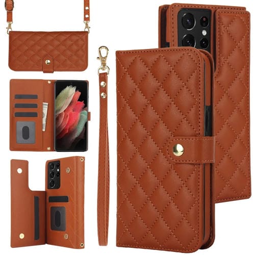Estuche para Teléfono Samsung Galaxy S21 Ultra 5G Crossbody Cuero Rómbico Multifunción (Marrón)