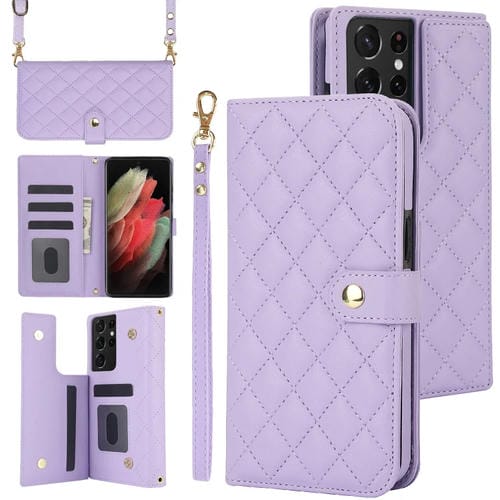 Estuche para Teléfono Samsung Galaxy S21 Ultra 5G Crossbody Cuero Rómbico Multifunción (Púrpura)