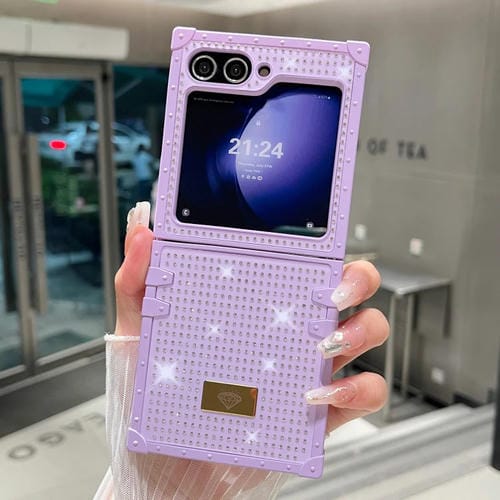 Estuche para teléfono Samsung Galaxy Z Flip5 5G PC a prueba de golpes con diamantes completos y logotipo (Púrpura)