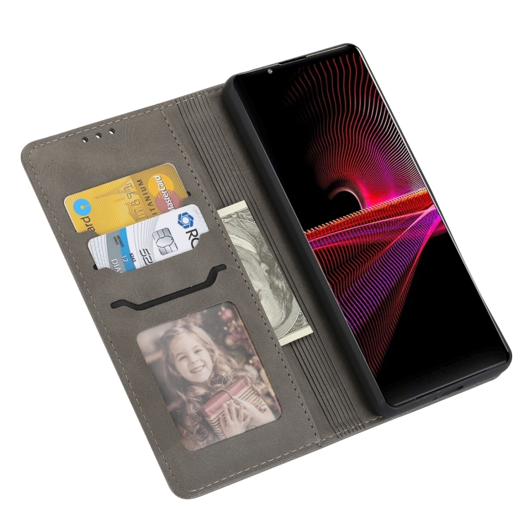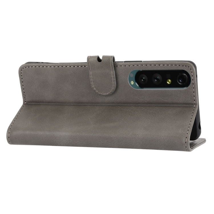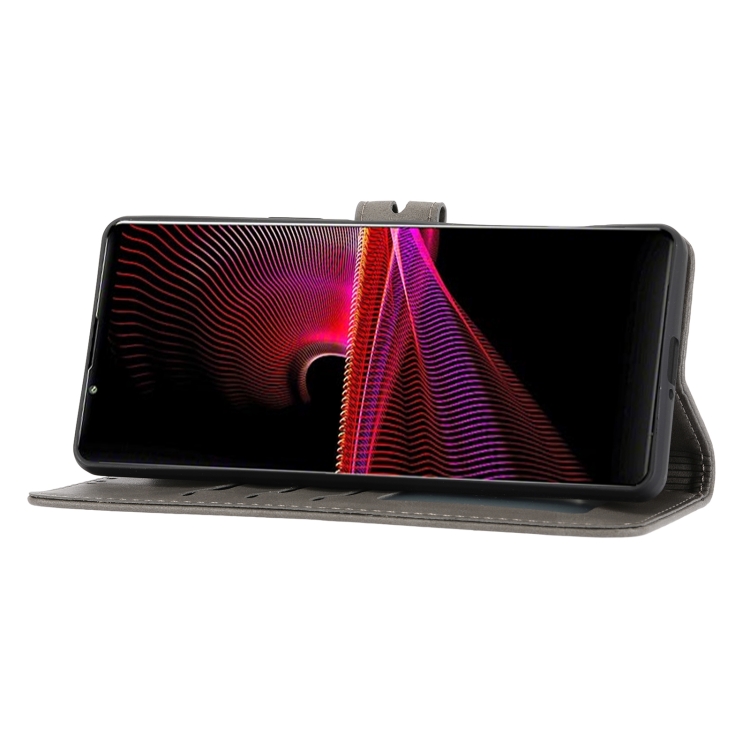 Estuche de Cuero para Sony Xperia 1 IV con Patrón de Gato Feliz Estampado (Gris)