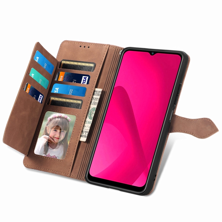Funda de Cuero para T-Mobile T Phone 2 5G con Cremallera y Flores en Relieve (Marrón)