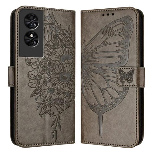Funda de Cuero para TCL 505 Se con Mariposa en Relieve (Gris)