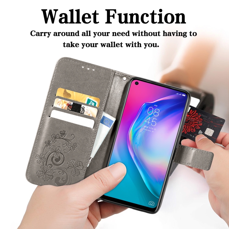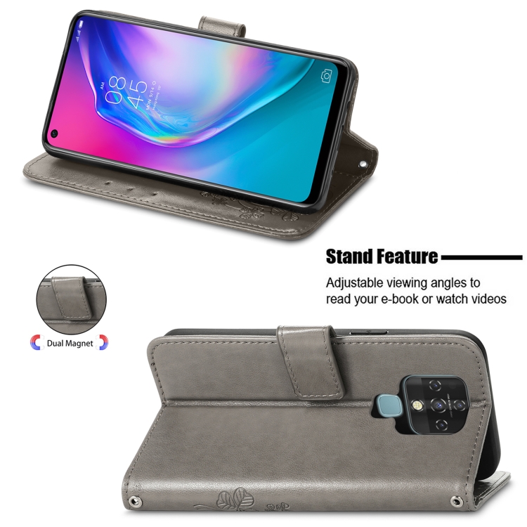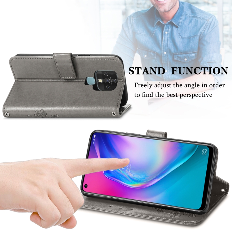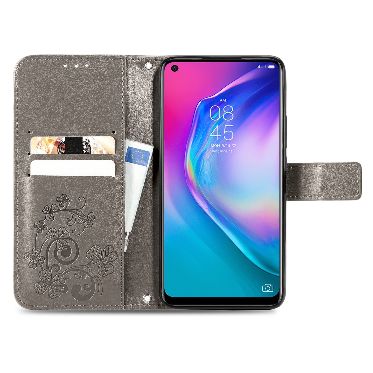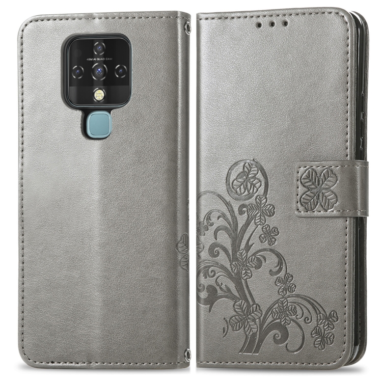 Funda de Cuero para Tecno Camon 16 Se con Cierre de Cuatro Hojas, Hebilla en Relieve, Ranura para Tarjeta y Soporte (Gris)