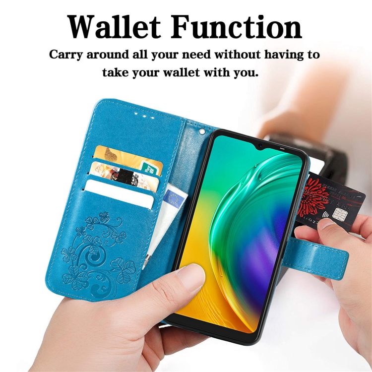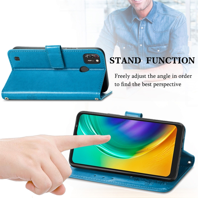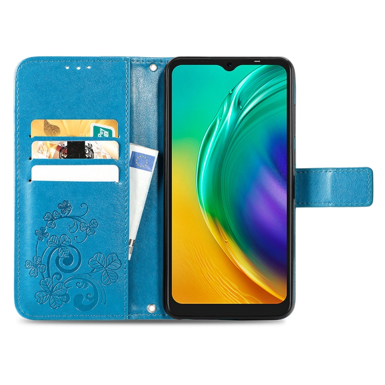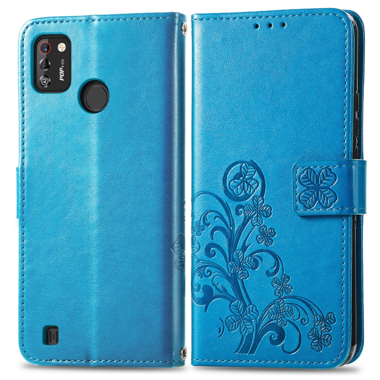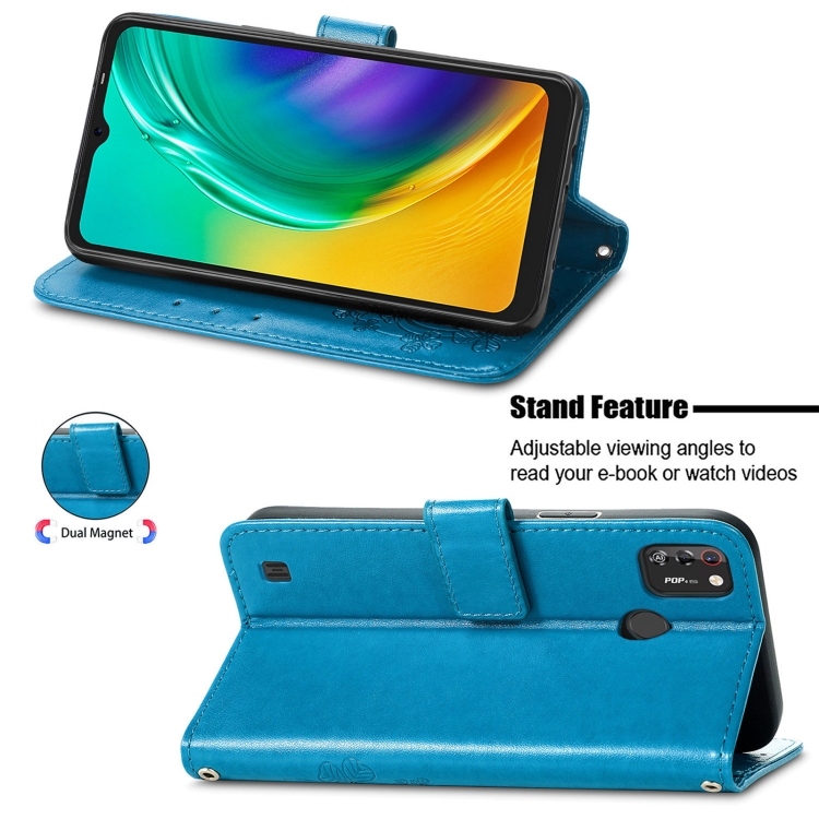 Funda de Cuero para Tecno Pop 4 Pro con Cierre de Cuatro Hojas, Hebilla, Ranura para Tarjeta y Soporte (Azul)