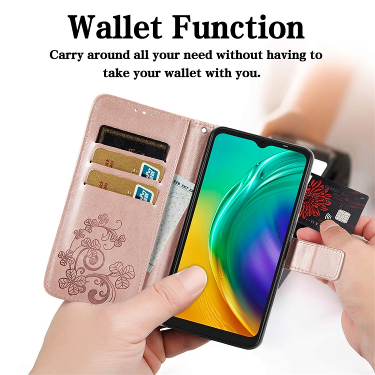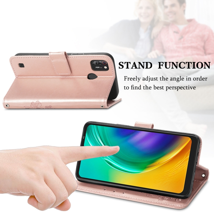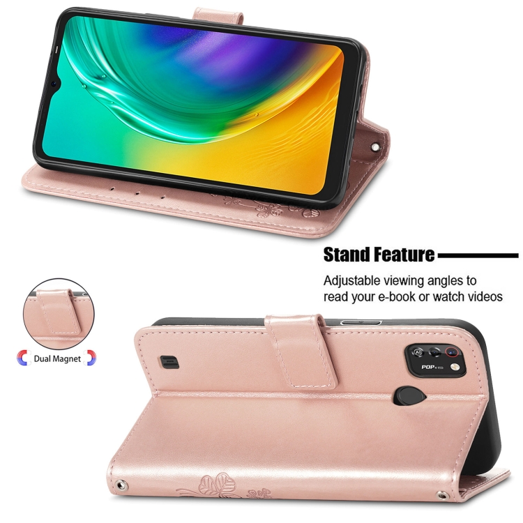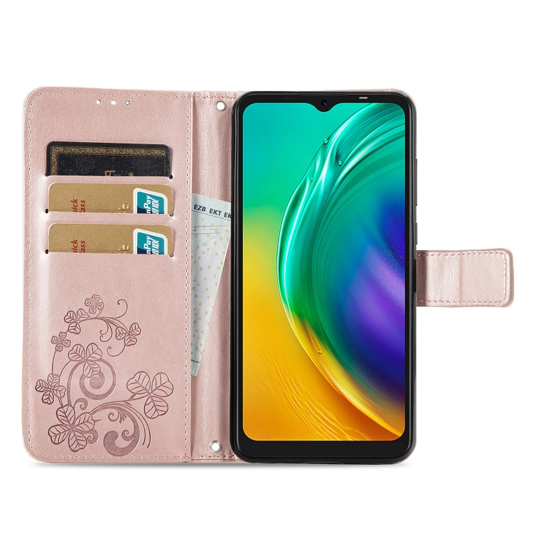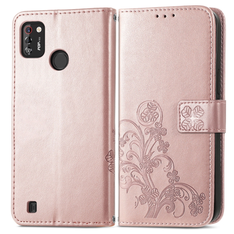 Funda para Tecno Pop 4 Pro con Cierre de Cuatro Hojas y Hebilla en Relieve, Soporte y Porta Tarjetas (Oro Rosa)