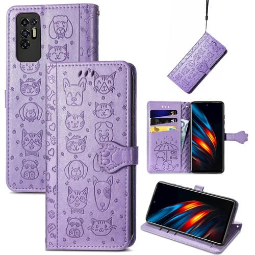 Funda de Cuero para Tecno Pova 2 con Estampado Gato y Perro, Soporte, Ranuras para Tarjetas y Billetera (Púrpura)