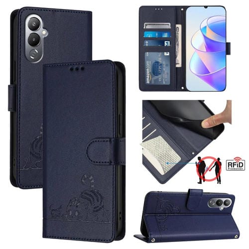 Funda para Tecno Pova 4 Cat Rat de Cuero Rfid con Patrón en Relieve y Cordón (Azul)
