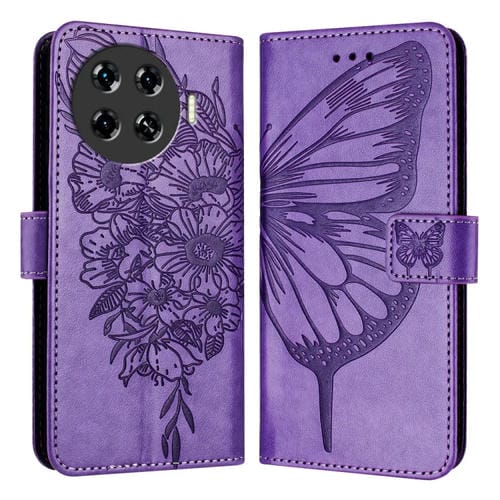 Funda de Cuero para Tecno Spark 20 Pro+ con Mariposa en Relieve (Púrpura Claro)