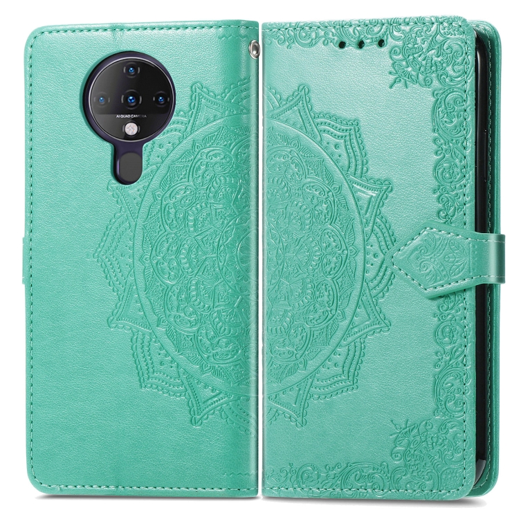 Funda de Cuero para Tecno Spark 6 Mandala Flower Horizontal Flip con Soporte, Ranura para Tarjeta, Billetera y Cordón (Verde)