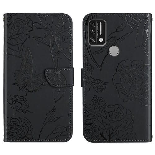 Funda de Cuero para Umidigi A9 Siente con Relieve de Peonía y Mariposa (Negro)