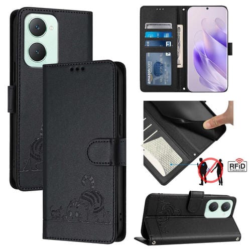 Para Vivo Y03 4G Global Cat Rat Estuche para Teléfono de Cuero Rfid con Patrón En Relieve y Cordón (Negro)