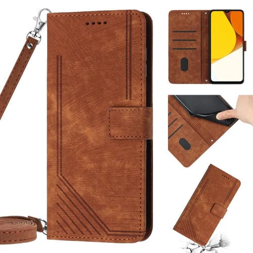 Para Vivo Y15S / Y15A / Y01 Skin Feel Stripe Pattern Funda de Cuero para Teléfono con Cordón (Marrón)