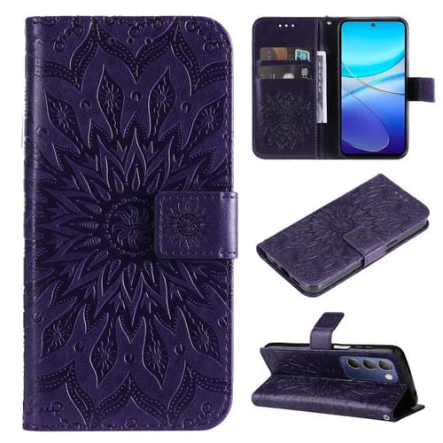 Para Vivo Y200E 5G Global / V30 Lite India Funda para Teléfono de Cuero con Tapa con Patrón de Girasol En Relieve (Púrpura)