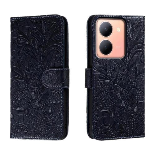Para Vivo Y78 Funda para Teléfono de Cuero con Tapa y Estampado de Flores de Encaje (Azul Oscuro)