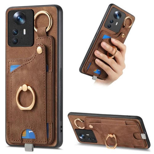 Para Xiaomi 12T / Redmi K50 Funda para Teléfono con Bolsa para Tarjeta con Anillo con Sensación de Piel Ultra Retro y Lazo para Colgar (Marrón)