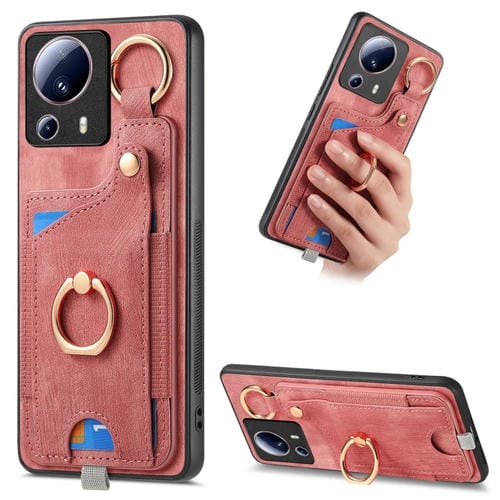 Para Xiaomi 13 Lite Funda para Teléfono con Bolsa para Tarjeta con Anillo y Sensación de Piel Retro con Lazo para Colgar (Rosa)