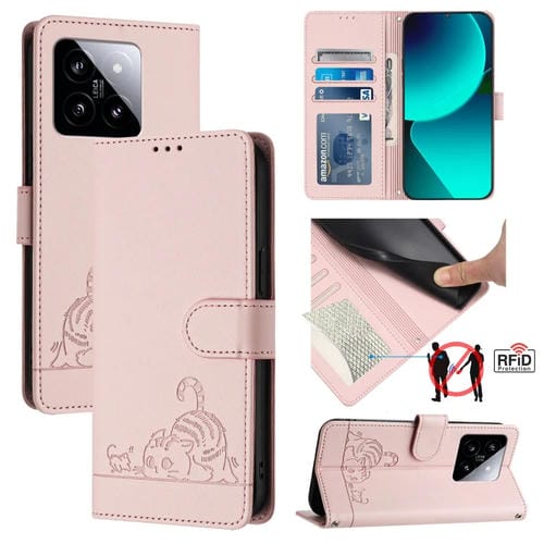 Para Xiaomi 14 5G Cat Rat Funda Para Teléfono De Cuero Rfid Con Patrón En Relieve Y Cordón (Rosa)
