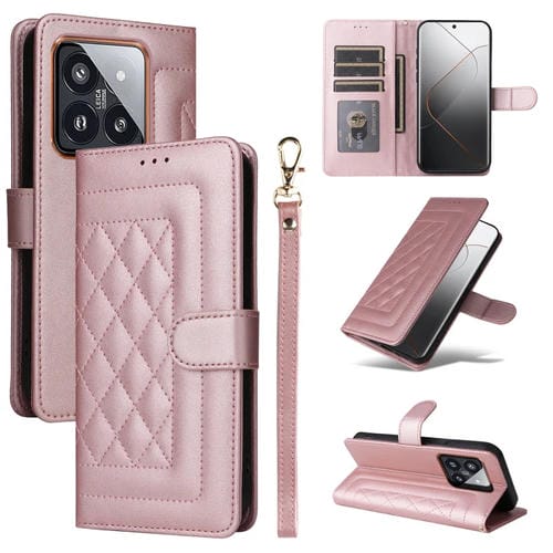 Para Xiaomi 14 Pro 5G Diamond Lattice Funda Para Teléfono Con Tapa De Cuero (Oro Rosa)