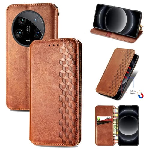 Para Xiaomi 14 Ultra Cubic Grid Funda De Teléfono De Cuero Magnético Prensado (Marrón)