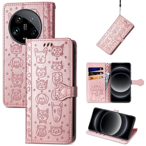 Para Xiaomi 14 Ultra Funda Para Teléfono De Cuero Con Relieve De Gato Y Perro (Oro Rosa)