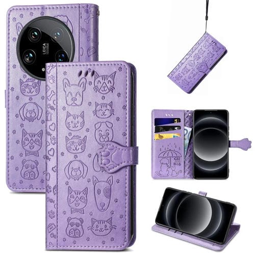 Para Xiaomi 14 Ultra Funda Para Teléfono De Cuero Con Relieve De Perro Y Gato (Púrpura)