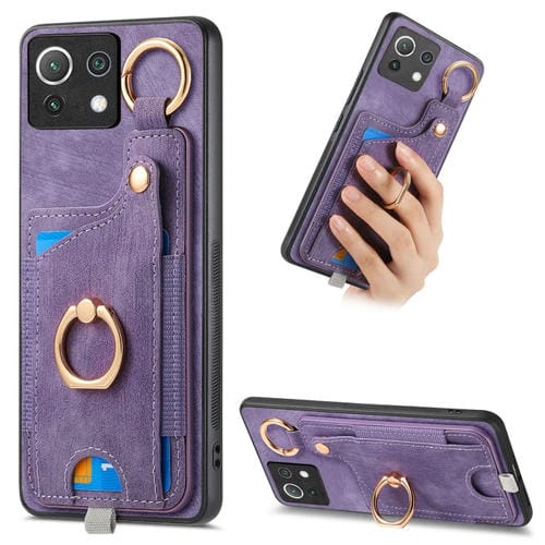 Para Xiaomi Mi 11 Lite Funda para Teléfono con Bolsa para Tarjeta con Anillo y Sensación de Piel Retro con Lazo para Colgar (Púrpura)