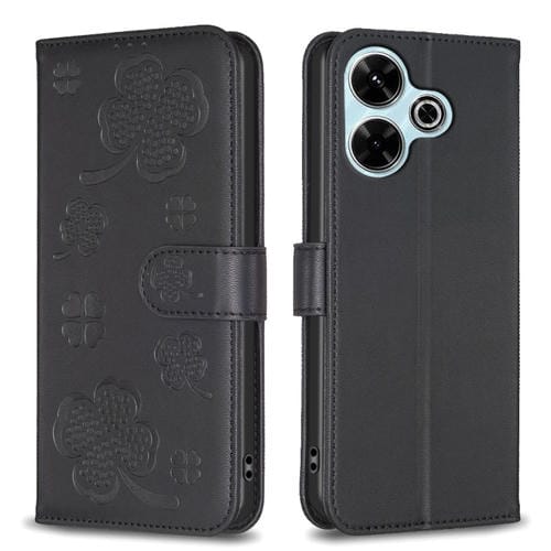 Para Xiaomi Poco M6 4G / Redmi 13 4G Funda para Teléfono de Cuero En Relieve de Cuatro Hojas (Negro)