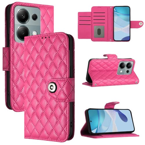 Para Xiaomi Poco M6 Pro 4G Funda para Teléfono con Tapa de Cuero con Textura Romboidal y Cordón (Rojo Rosa)
