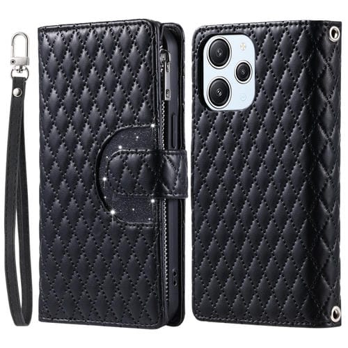 Para Xiaomi Redmi 13 4G Glitter Lattice Zipper Wallet Funda de Cuero para Teléfono (Negro)