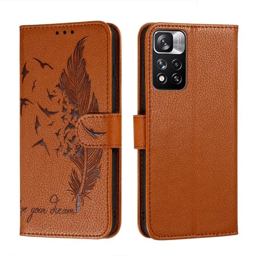 Para Xiaomi Redmi Note 11 Patrón de Plumas Pro Caja de Teléfono de Cuero de la Textura de Litchi con Soporte y Tragamonedas y Billetera (Marrón)