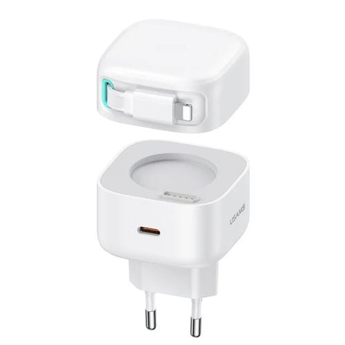 Cargador rápido Usams US-CC209 SMF Series PD35W Gan puerto dual 8 Pines + Tipo C (Blanco)