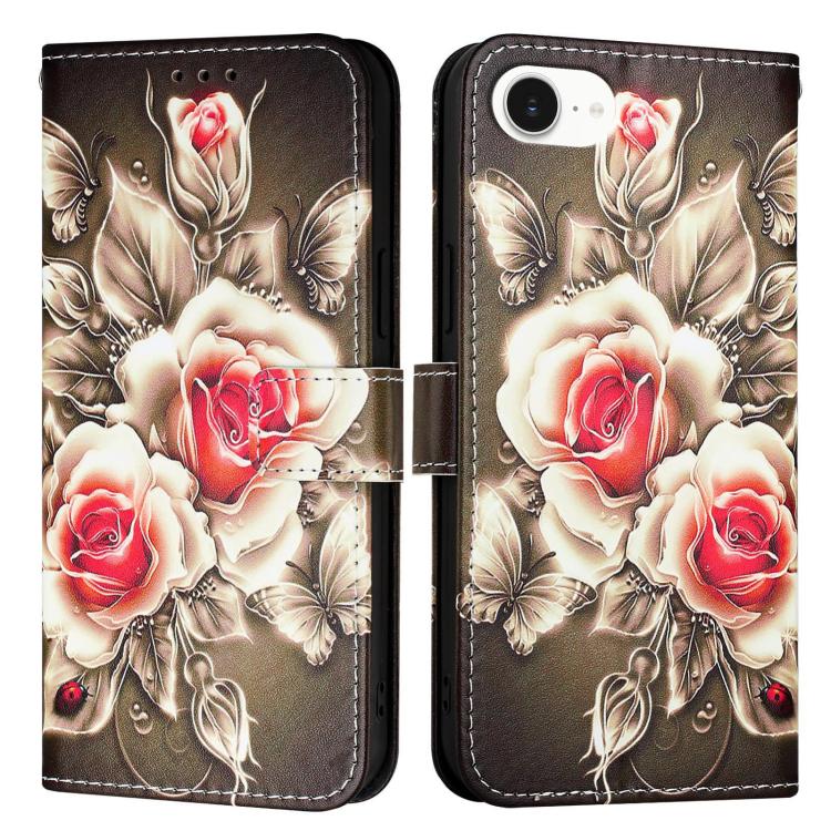 Funda de Cuero para iPhone 16E con Patrón de Dibujo de Colores (Rosas Sobre Negro)