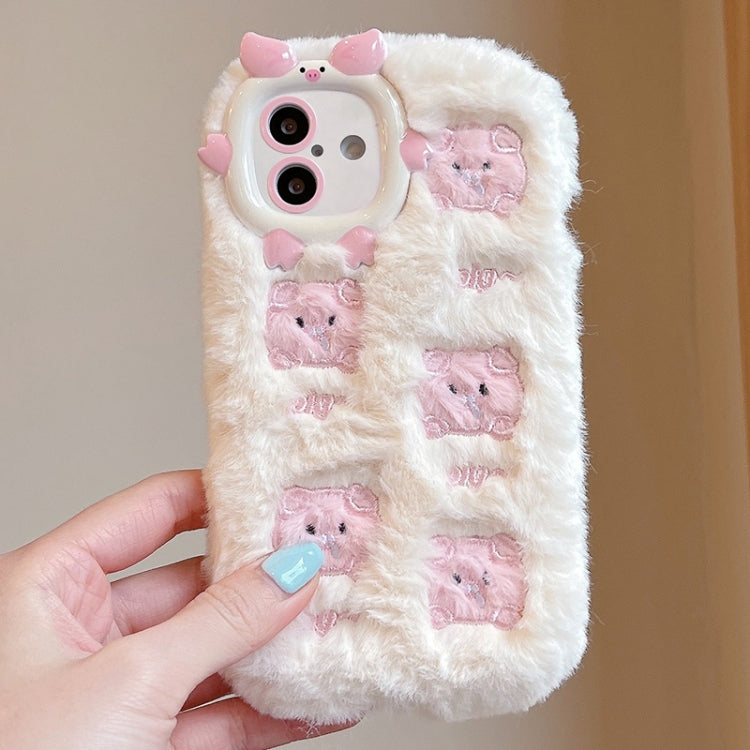 Funda para iPhone 16 Bordado de Felpa Cobertura Total (Cerdo Rosa y Blanco)