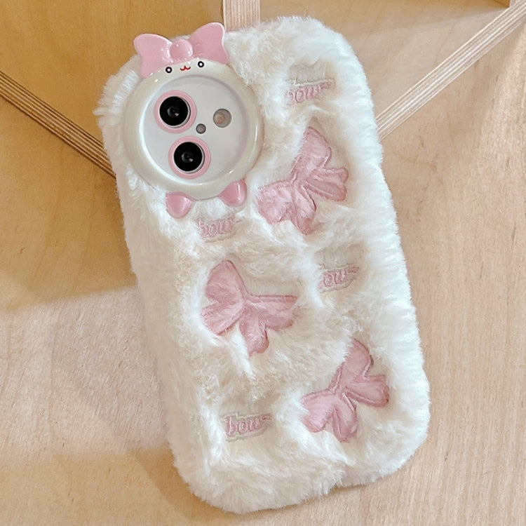 Funda para iPhone 16 Bordado de Felpa Cobertura Total (Blanco + Lazo Rosa)